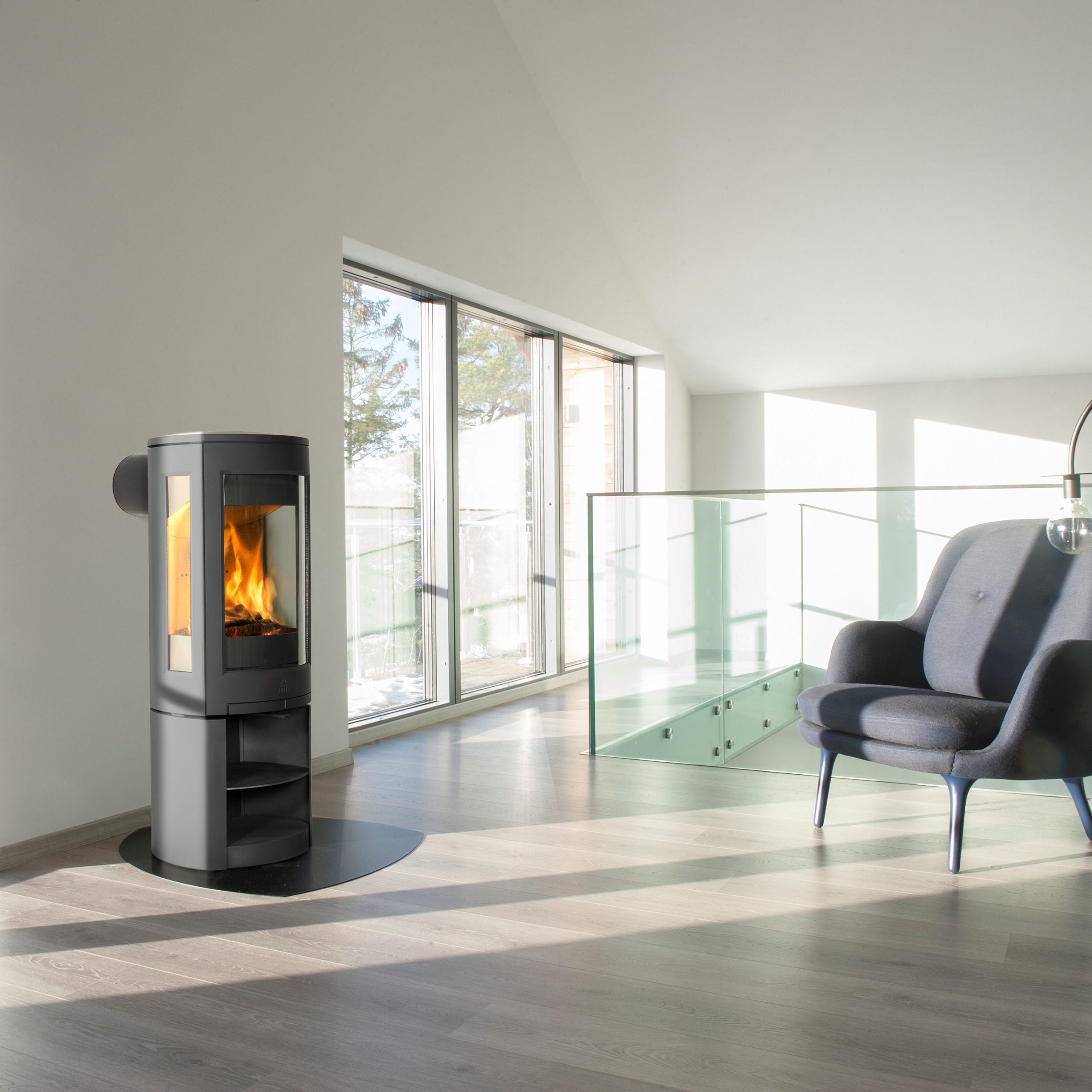 Jøtul F 371 Advance har en sokkel med rette linjer og en praktisk hylde til opbevaring. Det særlige ved denne moderne store brændeovn er det høje glas med stor synlighed til ildstedet. Brændeovnen fra Jøtul F 371 er designet med sideglas, hvilket er med til at give et lettere og mere luftigt udtryk.