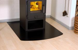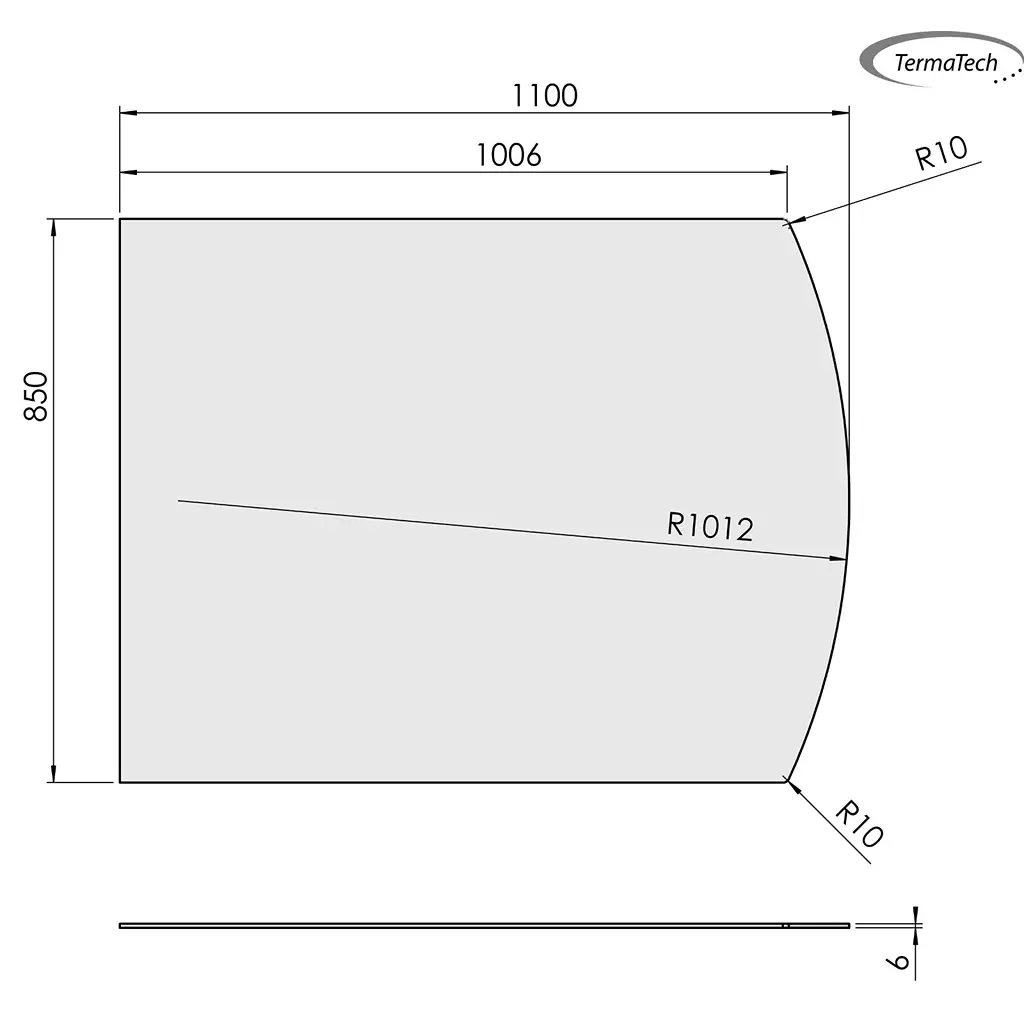 Gulvplade lige med flad bue 85 x 110 cm. Leveres i Glas 6 mm Sort og grå stål – 2 mm